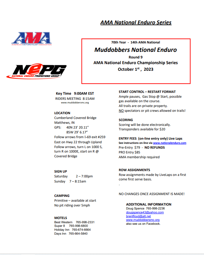 OCTOBER 4 – National Enduro (note this is a Saturday)