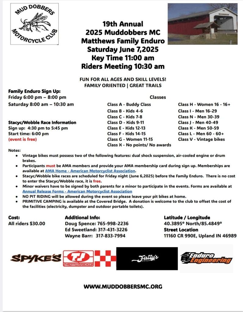 January 10, 2025September 30, 2025 Muddobbers Motorcycle CLub 2025 EVENT SCHEDULE JUNE 7 – Family Enduro (AMA membership is required) Go here to get AMA membership JULY 20 – Fun Trail Ride OCTOBER 4 – National Enduro (note this is a Saturday)
