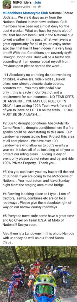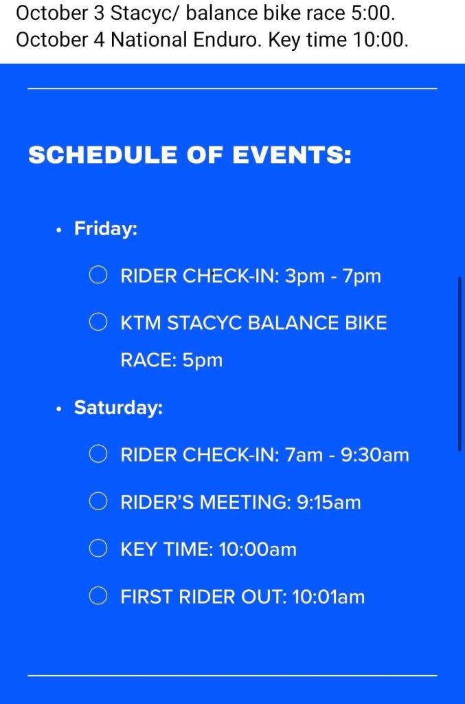 September 30, 2025September 30, 2025 Muddobbers Motorcycle CLub 72nd National Enduro Schedule of events https://www.facebook.com/share/p/1AAR7N4AHU/